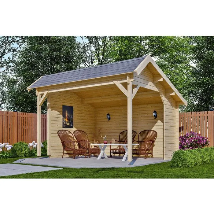 Casetas de madera pabellon 380x320cm con un espesor de pared de 40 mm, un hermoso y asequible dosel de estilo rústico con un techo a dos aguas asimétrico para relajarse y/o como espacio de almacenamiento. Las paredes laterales cerradas te protegen del viento. También se puede construir con espejo, fabricado en abeto escandinavo de alta calidad, certificado FSC y 10 años de garantía del fabricante. Como resultado de un crecimiento más lento, el abeto del norte de Europa es más duradero y resistente debido a la estructura más densa de la madera y contiene muchos menos nudos y resina que el abeto habitual, más barato, de Europa del Este. Esto también significa que la madera se pudre, se contamina o se humedece mucho menos rápidamente. Por eso, nuestras casetas de jardín y cabañas de madera tienen una garantía de 10 años. La moderna caseta de jardín o pabellon incluye todos los materiales de montaje, bisagras, cerraduras y cristal auténtico. Las puertas, ventanas y ventanas se fabrican mediante: Tecnología de tope que repele la humedad. Las bisagras y cerraduras están hechas de hierro de alta calidad y no de plástico como ocurre con muchos de nuestros competidores. Por último, todas nuestras casetas de jardín y cabañas de madera cumplen con las normas ISO. Material: Pino nórdico certificado natural/abeto escandinavo Dimensiones exteriores (ancho x fondo): 380 cm x 320 cm Dimensiones internas (ancho x fondo): 360cm x 300cm Grosor de la pared: 40 mm Altura de la cumbrera: 280 cmShow more